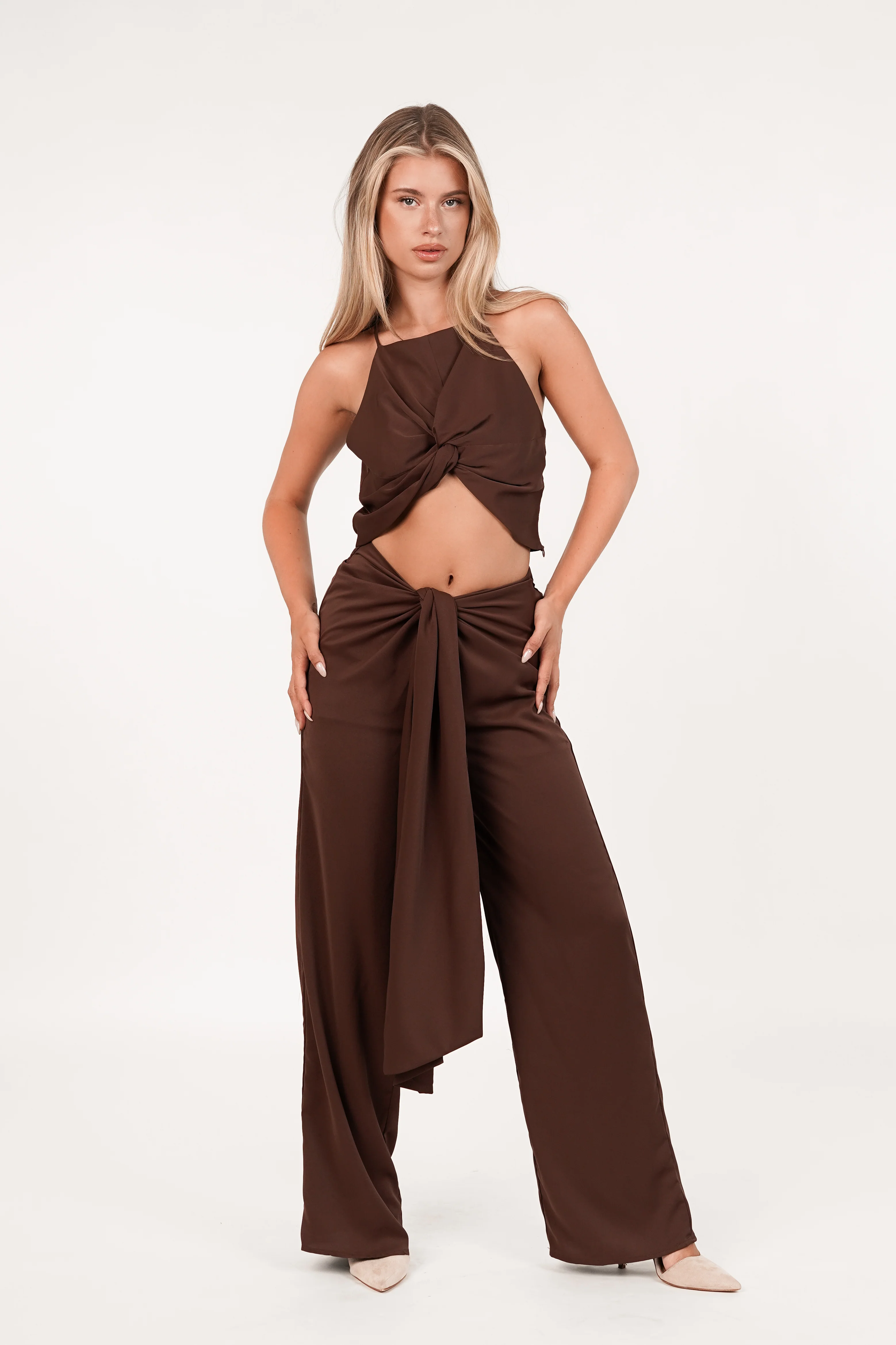 De Chrissy broek heeft een wijd uitlopend model en wordt aan de voorzijde vast gestrikt voor een low waist effect. Match met onze bijpassende top!